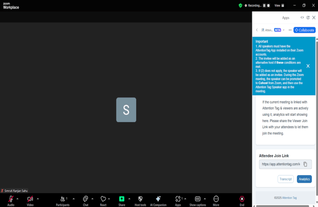 - In the launched Zoom App, go to Apps, click on Attention Tag speaker App